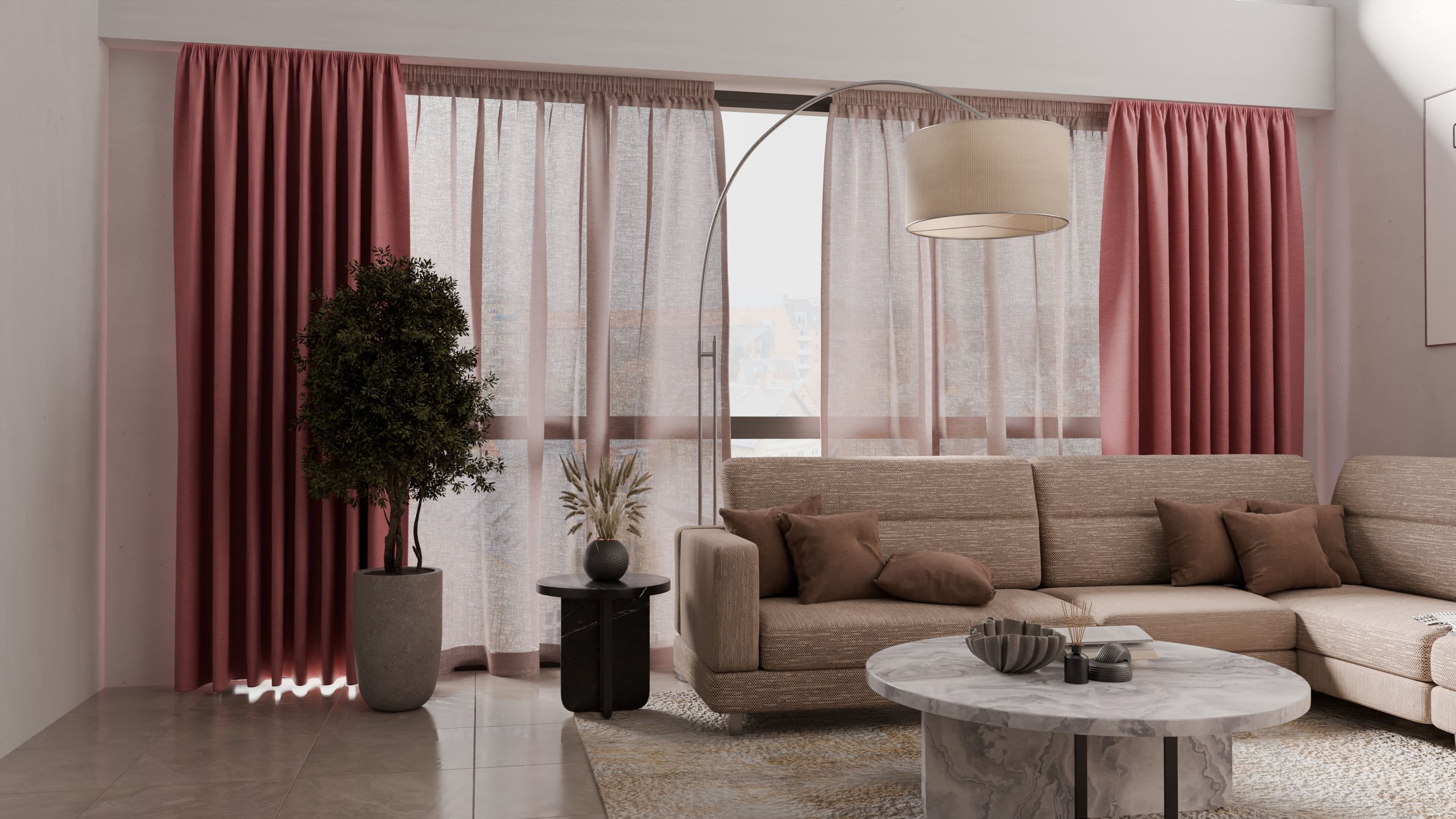 Kaksinkertaisten verhojen avulla valoa voidaan säädellä tarkasti. Päivällä läpikuultava kerros päästää luonnonvalon sisään pehmeästi ja suojaa samalla katseilta. Illalla paksumpi verho voidaan sulkea tuomaan yksityisyyttä ja hämärämpää tunnelmaa.