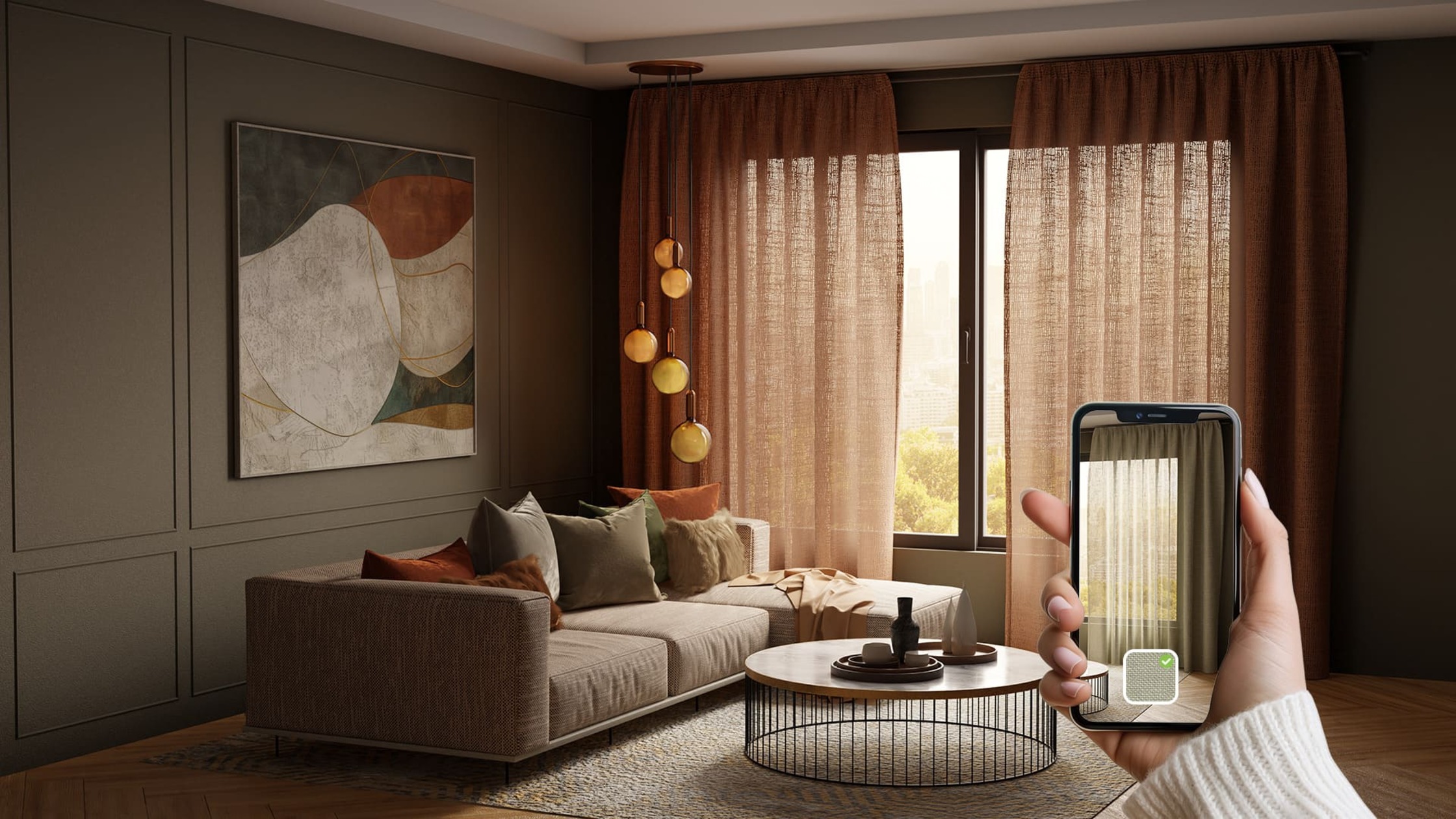 Oikea verhon väri tuo kotiin rauhaa ja tekee tilasta omalta tuntuvan. AI visualisointityökalumme auttaa sinua kokeilemaan sävyjä ja löytämään sen, joka tuntuu hyvältä.